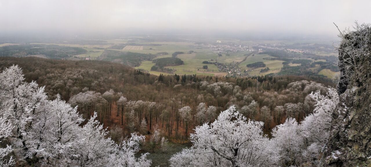 12:08 - Vystupujeme na vlakovém nádraží v Mimoni a díváme se do dálky na zamlžený vrcholek Ralska.