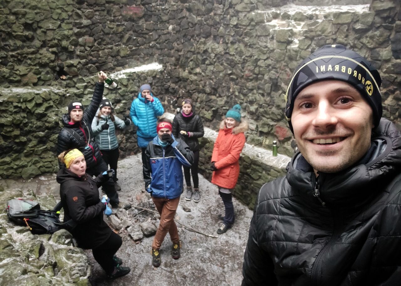 13:45 - Po vyčerpávajícím hodinovém stoupání se ocitáme nahoře v absolutní mlze. Sice není nic vidět, ale všudypřítomná námraza nám přeci jen vykouzlí úsměv na tváři. Hlavně ale víme, že jsme to dokázali, takže otevíráme šáňo a zalezeme si dát horký grog přímo do útrob zříceniny.